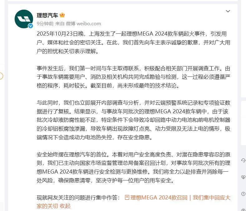 理想汽车表示,已主动向国家市场监督管理总局备案召回计划,对事故车同批次所有的理想MEGA 2024款车辆进行安全检测与更换维修。